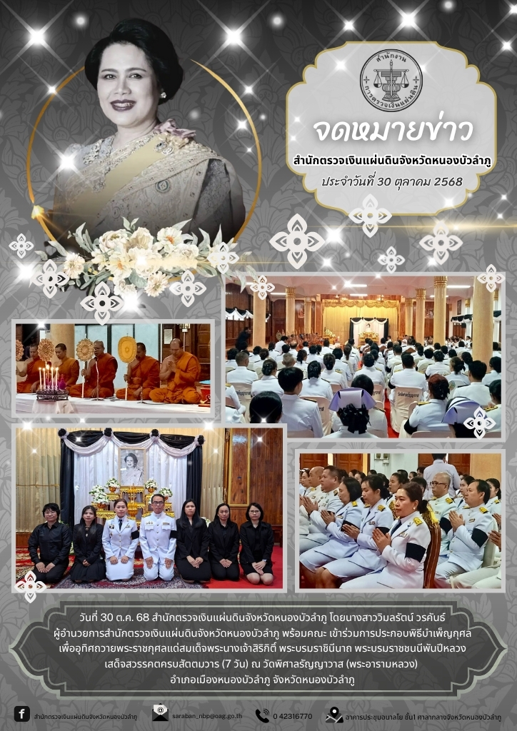 วันพฤหัสบดี ที่ 30 ตุลาคม 2568 ตั้งแต่เวลา 16.00 น. สำนักตรวจเงินแผ่นดินจังหวัดหนองบัวลำภู โดยนางสาววิมลรัตน์ วรคันธ์ ผู้อำนวยการสำนักตรวจเงินแผ่นดินจังหวัดหนองบัวลำภู พร้อมข้าราชการในสังกัด เข้าร่วมการประกอบพิธีบำเพ็ญกุศล เพื่ออุทิศถวายพระราชกุศลแด่สมเด็จพระนางเจ้าสิริกิติ์ พระบรมราชินีนาถ พระบรมราชชนนีพันปีหลวงเสด็จสวรรคตครบสัตตมวาร (7วัน) ณ วัดพิศาลรัญญาวาส (พระอารามหลวง) อำเภอเมืองหนองบัวลำภู จังหวัดหนองบัวลำภู