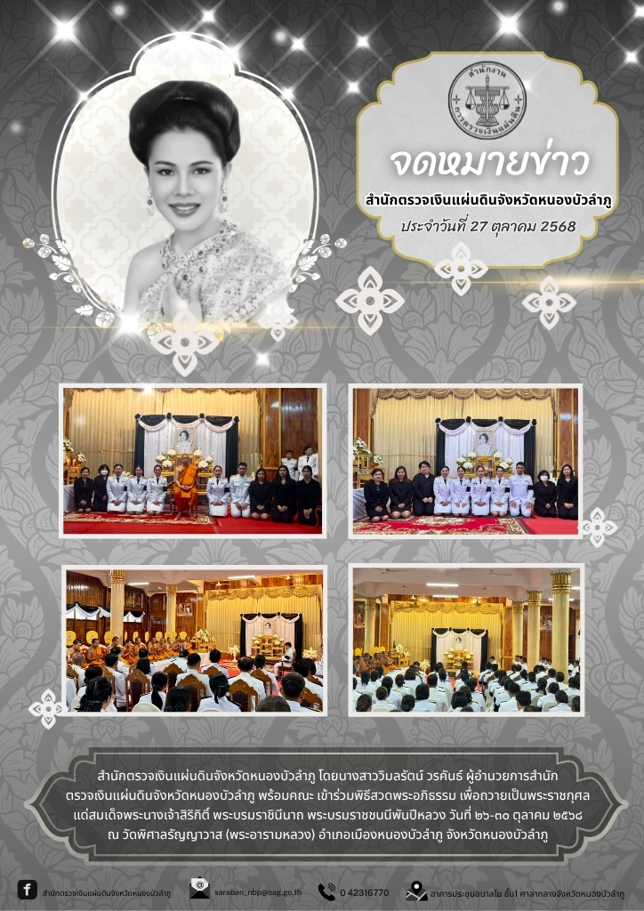 (วันที่ ๒๗ ตุลาคม ๒๕๖๘) สำนักตรวจเงินแผ่นดินจังหวัดหนองบัวลำภู โดยนางสาววิมลรัตน์ วรคันธ์ ผู้อำนวยการสำนักตรวจเงินแผ่นดินจังหวัดหนองบัวลำภู พร้อมคณะ เข้าร่วมพิธีสวดพระอภิธรรม เพื่อถวายเป็นพระราชกุศล แด่สมเด็จพระนางเจ้าสิริกิติ์ พระบรมราชินีนาถ พระบรมราชชนนีพันปีหลวง วันที่ ๒๖-๓๐ ตุลาคม ๒๕๖๘ ณ วัดพิศาลรัญญาวาส (พระอารามหลวง) อำเภอเมืองหนองบัวลำภู จังหวัดหนองบัวลำภู