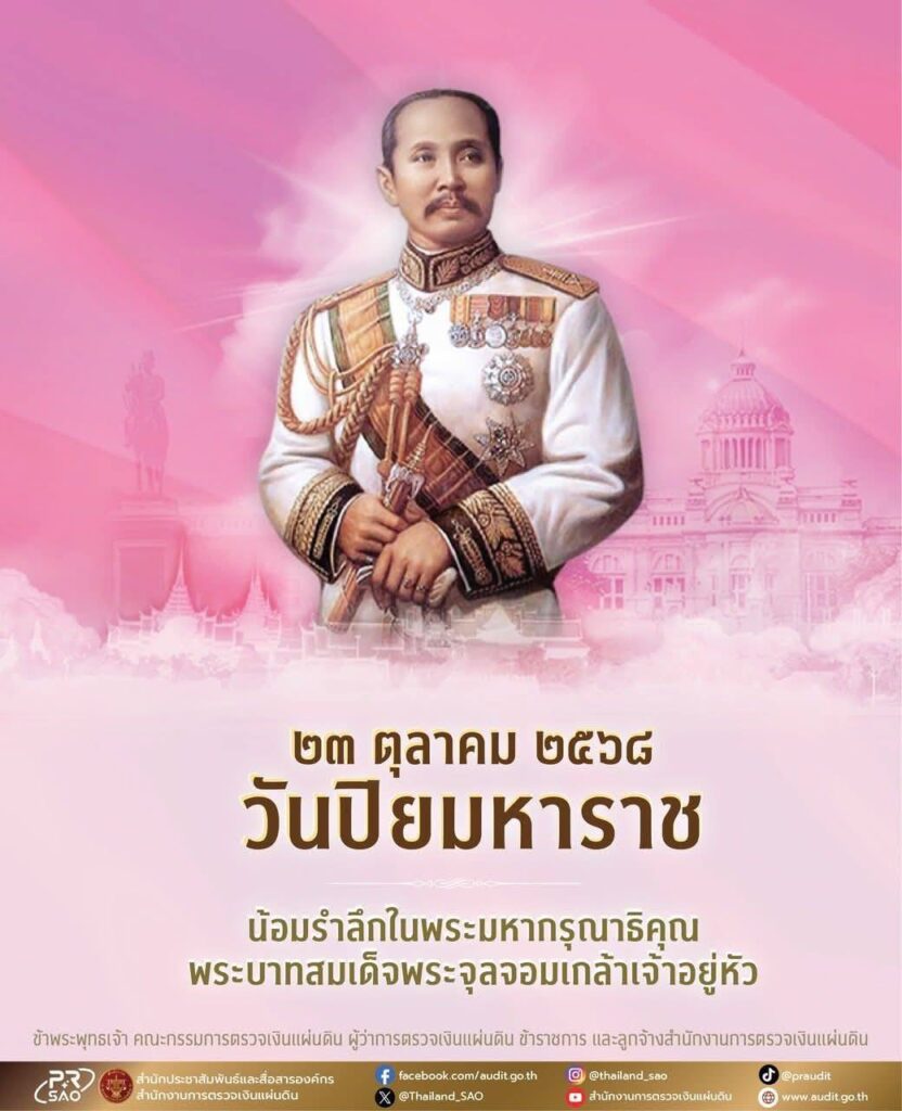 วันที่ 23 ตุลาคม 2568 นางสาววิมลรัตน์ วรคันธ์ ผู้อำนวยการสำนักตรวจเงินแผ่นดินจังหวัดหนองบัวลำภู พร้อมคณะเจ้าหน้าที่ตรวจสอบ เข้าร่วมพิธีน้อมเกล้ารำลึกในพระมหากรุณาธิคุณ พระบาทสมเด็จพระจุลจอมเกล้าเจ้าอยู่หัว 23 ตุลาคม วันปิยมหาราช ณ ลานบรมราชานุสาวรีย์ รัชกาลที่ 5 ศูนย์ราชการจังหวัดหนองบัวลำภู